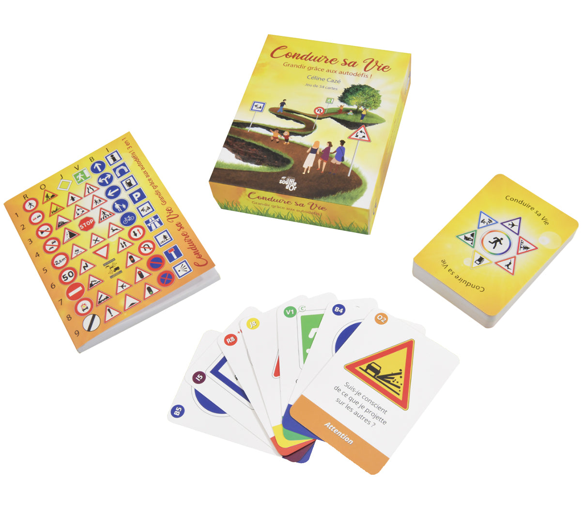 Conduire sa vie – 2ᵉ édition est un jeu de cartes de développement personnel conçu pour accompagner adultes et adolescents dans la réflexion sur leur parcours de vie. Inspiré du célèbre jeu Mille Bornes, il comprend 54 cartes illustrées représentant des panneaux de signalisation routière, chacun proposant un exercice de partage ou d’introspection. Cette nouvelle édition en coffret inclut un livret d’accompagnement et propose 12 usages différents, de l’animation d’ateliers à la pratique individuelle, en passant par le coaching ou les activités de groupe.